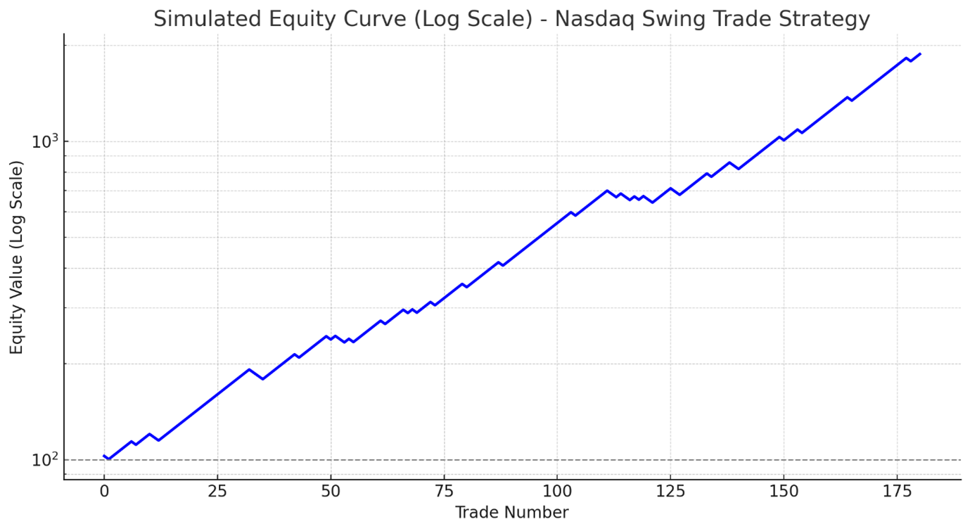 Here is the simulated equity curve for the Nasdaq swing trade strategy, plotted on a logarithmic scale. This curve visualizes the growth of equity over 181 trades, reflecting the strategy’s win ratio and average gains per trade. The log scale helps illustrate the compounded growth over time, showing the overall upward trend with occasional drawdowns. ​