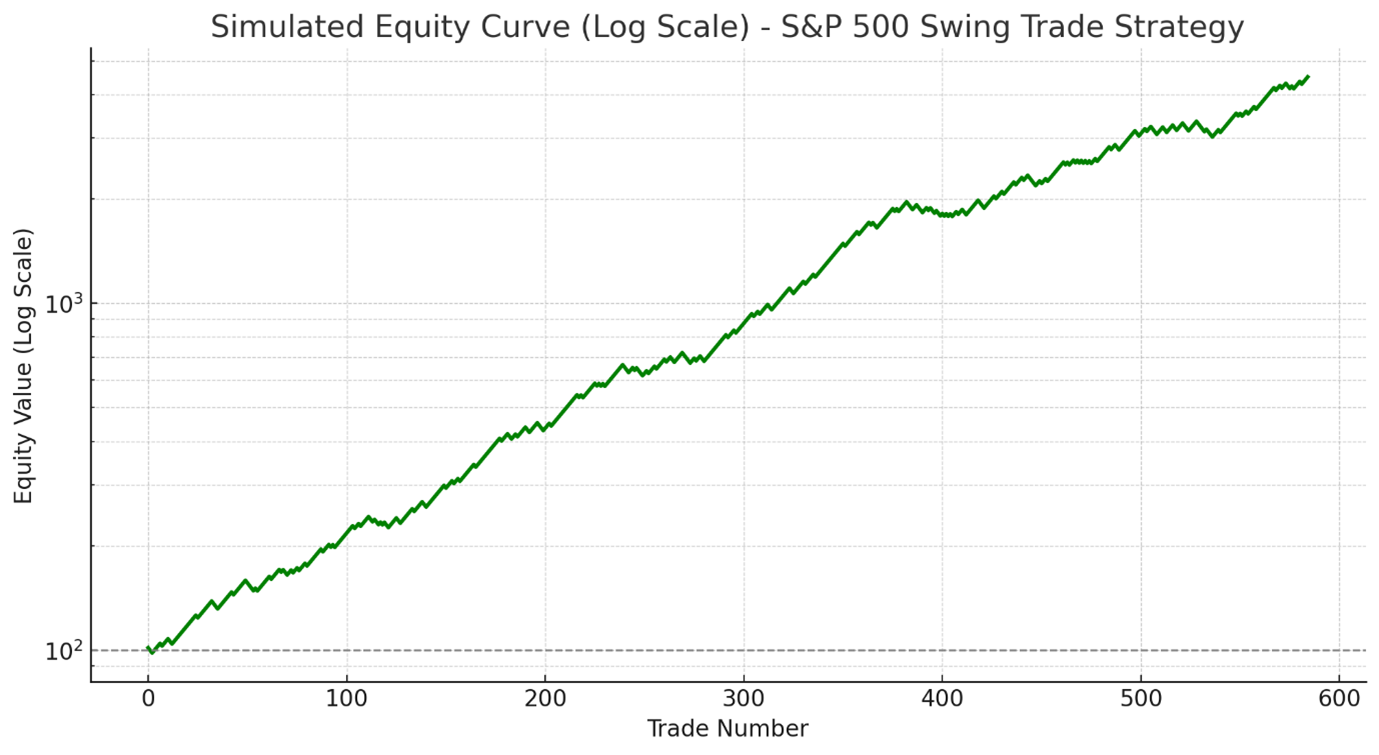 Here is the simulated equity curve for the S&P 500 swing trade strategy using the IBS indicator, plotted on a logarithmic scale. The curve reflects the strategy’s performance over 585 trades, demonstrating the consistent growth of equity with a few drawdowns, aligning with the strategy’s win ratio and average gains per trade.